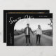 Modern and stylish save the date card featuring a hand lettered script text that says "save the date." One photo in the font and one on the back. The background is black.