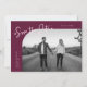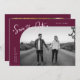 Modern and stylish save the date card featuring a hand lettered script text that says "save the date." One photo in the font and one on the back. The background is cranberry.