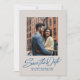 This stylish save the date features a retro inspired script "save the date" in a trendy blue under a single photo on a beige background along with simple custom text. The back of this modern save the date has a coordinating blue stripe along with a horizontal photo, room for a custom message and a QR code for your wedding website. This vertical design is great for a trendy and stylish couple and it's a great way for the engaged couple to share wedding information with friends and family. Find more colors and styles in the collection by Lea Delaveris Design. Also available as a digital save the date download.