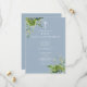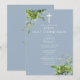 Cette invitation élégante de première sainte communion avec verdure d'eucalyptus botanique et bleu poussiéreux peut être personnalisée avec vos informations en typographie chic avec des initiales de monogramme au verso. Conçue par Thisisnotme©