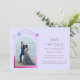 Mystical Pink Blue Sun Moon Star Astronomie spatiale Galaxie cosmique Céleste Save The Dates présente un soleil rose et violet, une lune et des étoiles encadrés sur un arrière - plan bleu. A l'intérieur est votre photo préférée et votre personnalisation enregistrer les informations de date. Personnalisez en modifiant le texte dans les zones de texte. Conçu pour vous par ©Evco Studio www.zazzle.com/store/evcostudio