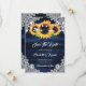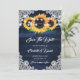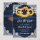 Navy blue and sunflower wedding save the date card featuring sunflowers and delicate floral lace against a rustic wood background.