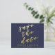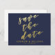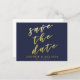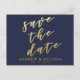 NewParkLane - Elegant Postcard, with 'Save the date' in elegant faux gold foil script typography, against a navy blue background. Easy to customize in Zazzle with your own names, date or other text for a personalized design. All text style, colours, sizes can be modified to fit your needs. You can also change the background colour to any colour you prefer.