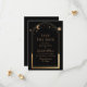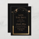 Celestial Black Save The Date Anniversaire Quinceanera Invitation présente un cadre doré, lune et étoiles sur un arrière - plan noir. À l'intérieur est votre Quinceanera personnalisée enregistrer les informations de date. Personnalisez en modifiant le texte dans les zones de texte. Conçu pour vous par ©2024 Evco Studio www.zazzle.com/store/evcostudio
