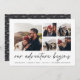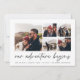 Moderne et passionnant, enregistrez la carte de date pour le couple aventurier, ce design épuré et simple comprend cinq photos carrés dans une grille de montage, avec "notre aventure commence" ci-dessus en écriture douce cendrée noire. Personnalisez avec vos faire-part, noms et détails supplémentaires le long du bas, et ajoutez plus (comme votre site Web mariage) à l'arrière.