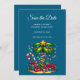 Enregistrez la carte de date avec une image de vacances saisonnière. Un palmier tropical orné de lumières festives surmonté d'une étoile. Un sucre de canne géant rouge et blanc qui sort du sable. Cadeaux de Noël sous l'arbre. Whimsical et amusant.