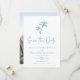 Ce simple mariage tropical simple, sauf la carte datant, est composé de deux palmiers en haut, avec un texte classique et élégant, dans une palette de couleurs blanc et bleu aqua/turquoise, avec un modèle photo à l'arrière.