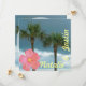 Plage tropicale sauvez la date avec palmiers, hibiscus rose corail et texte amusant gras. Une façon idéale d'annoncer un mariage de destination à venir en bord de mer.