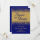 Une carte moderne classe "Save the Date" avec un effet parties scintillant or sur un riche arrière - plan bleu royal. Vous pouvez entièrement personnaliser en cliquant sur le lien personnaliser. Il fait partie d'une belle suite mariage assortie qui comprend l'invitation, le menu et beaucoup d'autres éléments.