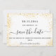 Un moderne et élégant Save the Date pour un mariage. Arrière - plan blanc décoré de parties scintillant faux or. brille. Personnalisez et ajoutez une date et des noms. Le texte : Save the Date est écrit avec un grand script de style à la main tendance.