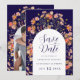Annoncez votre journée spéciale en style avec ce Fleur sauvage Photo Arch Automne marine bleu et blanc Mariage Enregistrer la date. Alliant charme d'automne et élégance raffinée, ce design présente des fleurs sauvages aquarellés peints à la main disposés autour d'une arche gracieuse. La palette riche et saisonnière (orange brûlé, terre cuite, marron, orange, violet, jaune, corail, bois brûlé, pêche et rose pâle) saisit la chaleur et la beauté naturelle de l'automne. Élégant script bleu marine associé à la typographie moderne sur un arrière - plan d'arc blanc et élégant ajoute une touche raffinée, tandis que les fleurs fantaisistes apportent une touche personnelle d'inspiration boho. Le modèle facile à utiliser comprend une arche photo personnalisée, idéale pour présenter le couple heureux. Avec ses oeuvres originales et son design de l’artiste Catherine Sweetman, Save the Date donne le ton d’une fête romantique et cosy et donne un aperçu charmant de ce qui va se passer.