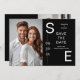 Cet élégant, minimaliste, simple, code QR, 2 photos mariage Enregistrer la carte Date dispose d'arrière - plan noir avec la calligraphie blanche moderne et initiales, monogramme.