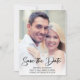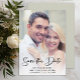 Carte de photo de carte d'annonce de mariage à conserver personnalisée avec les noms de la mariée et du futur marié, date et lieu du mariage.