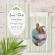 Cette carte de sauvegarde de photo de mariage côtier fantaisiste comporte une bordure en dentelle, des palmiers et un fond rayé de sauge élégant. Parfait pour un mariage sur la plage ou en Californie. Votre photo est encadrée dans un cadre en dentelle fantaisiste au verso. Créé par Simply Farmhouse Press.