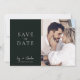 Ce mariage moderne sauvez le modèle de la carte de date avec un motif feuille tropical et un arrière - plan vert foncé présente votre photo, les noms, et la date du mariage.