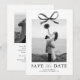 Annoncez votre prochaine célébration avec style et élégance grâce à ces cartes de save the date de mariage modernes. Conçues avec un fond blanc impeccable, l'avant présente un superbe centre de photo accentué par un nœud en aquarelle noir classique, ajoutant une touche de romance et de sophistication.