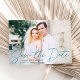 Annoncez votre date mariage dans le style avec notre photo moderne tendance enregistrer les cartes de date. La conception affiche votre photo de fiançailles horizontal avec "Enregistrer la date" dans une superposition manuscrite turquoise avec un dégradé blanc en option. Personnalisez l'avant de sauvegarder le carte photo de date en ajoutant vos noms, votre date de mariage et votre emplacement de mariage. Le simple enregistrement du carte photo de date revient à un motif géométrique pointillé turquoise et blanc.
