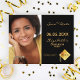 On front: Add your own vertical size photo of the graduate. A chic black background colour. Templates for a name and date. Golden letters. The name and the text: Save the Date are written with a modern hand lettered style script.