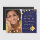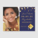 On front: Add your own vertical size photo of the graduate. A navy blue background colour, decorated with faux gold stars. Personalize and add a name and date. Golden letters. The name and the text: Save the Date are written with a modern hand lettered style script.