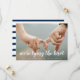 Nautical enregistrez la carte de date avec votre image horizontale fond saigné et une superposition de texte avec les mots "nous lions le noeud" dans une police d'écriture blanche. Vous trouverez ci-dessous vos détails en une seule ligne de texte. L'arrière a des rayures bleu marine et blanc et une ligne de texte pour plus d'informations. Un design simple et moderne qui fait de votre photo la principale caractéristique.
