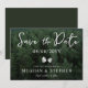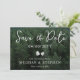 Une carte rustique Save the Date avec un arrière - plan photo pittoresque de la forêt verte de Destei et un texte élégant avec le texte "Save the Date". La date est affichée en évidence au-dessus de deux silhouettes délicates en pin qui ajoutent une charmante touche boisée. Ci-dessous, une ligne classique invitations invités au mariage du couple avec espace pour les noms et une note qu'une invitation formelle suivra. Le dos de la carte montre un arrière - plan vert avec des silhouettes de pinecone assorties encadrant une zone personnalisable pour les initiales du couple et la date du mariage. Idéal pour les couples amoureux de la nature qui souhaitent séjourner en mariage rustique, en plein air, en randonnée ou en forêt.