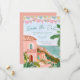 This destination wedding Save the date features painted artwork of a Mexican beach town scene with papel picado banners on top. All the important wedding details can be personalized. Colors include green, pink, blue, white and coral.