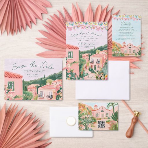 Save The Date Pink Mexican Town Destination Wedding