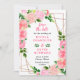 This fun and whimsical save the date invitation features watercolor pink roses and foliage on a gold geometric frame. The text combines handwritten script and serif fonts for a stylish and modern look. This is perfect for a spring or summer rustic wedding.