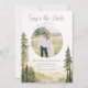 Photographie Mariage chrétien Enregistrer la carte Date représente un design d'aquarelle nature simple incluant des pins et des montagnes dans les tons de terre de sauge, vert et bronzé. Le dos présente une citation mariage inspirante, "Deux vies unies dans l'amitié, Deux amis unis dans l'amour, Un amour uni dans le Christ."