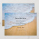 Enregistrez la carte datte avec une photo d'une plage de sable brun doré avec surf mousseux blanc et eau bleue.