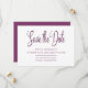Conception élégante et profonde de prune violette et blanc. Save the Date est écrit dans un texte de script magnifique. Vous trouverez ci-dessous vos noms, votre date de mariage et votre emplacement. Vous pouvez inclure un message supplémentaire au verso.