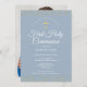 Une élégante Première Sainte Communion sauvez l'invitation de la date avec la poussière d'or délicate. Vous pouvez personnaliser avec vos détails de célébration en texte chic sur un arrière - plan bleu poussiéreux et une photo spéciale au verso. Conçu par Thisisnotme©