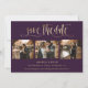 Elégant violet et or mariage 4 photo enregistrer les cartes de date avec un titre de script de feuille d'or faux moderne. Personnalisez facilement ce mariage violet enregistrez la date avec vos images et les détails du mariage, y compris un site Web mariage.