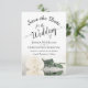Ce mariage Save the Date card est romantique, élégant, classe et belle. Il présente une photo d'une rose blanche à longue tige réfléchissant dans un bassin d'eau avec des vagues et des ondulations. Le texte est une calligraphie de script sophistiquée sur un arrière - plan blanc. L'arrière est orné d'une jolie couleur d'ivoire ou de crème marbrée. Une façon idéale de faire connaître votre prochain mariage à vos amis et à votre famille.