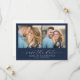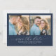 This Save the Date card features a romantic and elegant design with two photos of a couple, capturing their joyful expressions. The color palette includes soft blues and warm tones, creating a serene and inviting atmosphere. The layout is balanced, with the images framed by a navy border that highlights the central text area. The typography is stylish and modern, adding a touch of sophistication to the overall look. Perfect for announcing an upcoming wedding, this card sets the tone for a memorable celebration in Portland, Oregon.