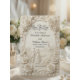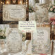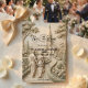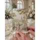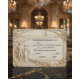 Evoke the grandeur of a historic European estate with this neo-classical illustration featuring a romantic couple in a formal cathedral garden setting.This design features a sophisticated trompe l'oeil visual effect that simulates the look of a hand-carved stone bas-relief sculpture. The monochrome palette utilizes soft ivory, cream, and warm beige tones to depict a bride and groom walking away down a winding cobblestone path, flanked by manicured hedges and tall cypress trees, leading toward a majestic Gothic cathedral. The typography hierarchy balances elegant black calligraphy for names with a vintage serif font for details, ensuring high readability against the faux-textured background. This is a flat printed image with a faux stone effect, not actual raised material.