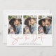 Art Déco Rose Gold manuscrit Enregistrer la date Carte photo multiple dans une police élégante qui évoque une atmosphère romantique manuscrite. Au fond, un design art déco géométrique et tendance, en papier doré rose chic. Conçu pour utiliser trois de vos photos préférées pour une personnalisation supplémentaire. Ajoutez facilement vos noms et dates pour un design vraiment personnalisé.