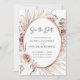Faire-part de mariage Cadre métallisé Rose Gold avec fleurs séchées et feuilles de palmier dans les tons rose blush... Notre luxueux faire-part de mariage bohème présente un arrangement de belles roses rose blush, d'eucalyptus et de feuilles de palmier séchées autour d'un faux cadre ovale métallisé rose gold, créant une bordure élégante pour le texte de l'invitation à l'intérieur. Le verso de la carte contient les informations sur votre site web de mariage et un modèle de graphique de code QR que vous pouvez remplacer par le vôtre (ou supprimer). Tout le texte d'exemple sur les deux côtés de la carte (sauf le graphique du texte "Save the Date") peut être facilement révisé avec vos propres détails sur le modèle de personnalisation.