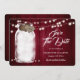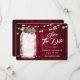 Mariage rustique bordeaux enregistrez la carte de date avec un pot de maçon et les coeurs de burlap contre un arrière - plan en bois de grange orné de lampes à cordes. Personnalisez facilement ce mariage romantique rustique bordeaux enregistrer la date en ligne. Objets correspondants disponibles pour compléter ce mariage bordeaux enregistrer la date.
