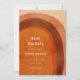 Mariage de Boho sauver la date avec une arche abstraite peinte dans des couleurs terreuses du désert d'orange brûlée, de terre cuite, de rouille et de brun. Les détails de votre mariage sont dans une mise en page moderne avec vos noms dans une police de style rétro pour une tournure amusante. L'arrière a votre photo préférée.
