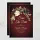 Bouquet floral d'aquarelle traité avec un rinçage sépia, sur une toile rouge rougeâtre riche et brûlée, finie par une élégante calligraphie en ivoire. Le résultat est une sauvegarde de l'invitation à la date appropriée pour les thèmes décontractés et plus formels automne / mariage automne.