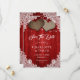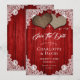 Complétez votre mariage romantique rustique rouge avec ces magnifiques mariages en burlap et dentelle enregistrez les cartes de date avec deux coeurs en burlap sur un arrière - plan en bois de grange rouge décoré de lumières à cordes et dentelle fleurie blanche. Éléments correspondants disponibles.