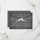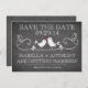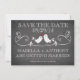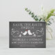 Annonce de mariage chic et tendance sur tableau noir vintage avec une paire d'oiseaux de l'amour mignons avec un cœur posé sur une branche fleurie élégante. Pour un effet encore plus spécial, le verso de nos invitations correspond à notre design de devant. Annonce de mariage moderne sur tableau noir très populaire. Timbres-poste et aimants assortis pour save the date disponibles.