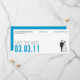 Un design contemporain épuré est compensé par un dessus de gâteau de mariage traditionnel en noir et blanc représentant les mariés. Parfait pour le couple moderne qui apprécie le kitsch. La date de votre événement ne sera pas oubliée lorsqu'elle se démarque en bleu vif. Facilement personnalisable avec vos propres informations. Ajoutez l'URL de votre site web de mariage au dos. Disponible avec des produits assortis ainsi que des designs et des couleurs alternatives.