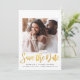 Mariage moderne minimal enregistrez la carte de faire-part date avec deux de vos photos (1 sur le devant, 1 sur le dos), "Save the Date" écrit dans un script style or faux feuille et votre date mariage, le lieu et les informations du site Web dans une simple typographie.