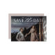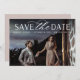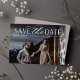 Une carte de datation moderne conçue pour accommoder votre photo de fiançailles à fond à orientation horizontale ou paysagère préférée. "Enregistrer la date" apparaît en haut de votre photo en bloc blanc et en écriture de script, avec vos noms, date mariage et emplacement du mariage en dessous. Les cartes sont inversées pour afficher d'autres informations sur la date.