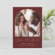 Cette simple et minimaliste carte Save the Date présente une arche photo boho au-dessus des mots "Save the Date" dans un élégant script d'écriture dorée, suivi des noms du couple, date mariage et ville en sans serif police sur un arrière - plan rouge bordeaux. Ajoutez un message plus détaillé avec des informations supplémentaires sur l'inverse.