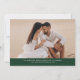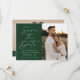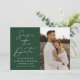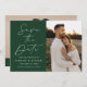 Annoncez votre prochain mariage dans le style avec cette photo moderne de Script vert enregistrer la carte de date! Le design comporte "Save the Date" affiché en calligraphie blanche tendance avec un arrière - plan vert foncé. Personnalisez l'avant du minimaliste enregistrez la date avec vos noms, la date du mariage, l'emplacement et la photo fiançailles verticale. Le verso de la carte affiche une photo horizontale avec votre site Web mariage ci-dessous. Le vert chic sauve la date le choix parfait pour les mariages modernes.