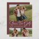 Avec trois photos et un script moderne écrit "save the date" en blanc sur un arrière - plan en brique rouge, cette carte est le moyen parfait pour annoncer votre fiançailles et mariage à venir à vos amis et votre famille. Le texte blanc est audacieux et moderne mais toujours sophistiqué. Le texte personnalisable sur le devant a de la place pour les noms, la date, l'emplacement et d'autres informations comme un site Web mariage. Le dos est un mauve assorti avec un mouchoir blanc étoilé. Vous pouvez modifier la couleur en cliquant sur "customiser plus loin".
