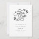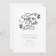 Cette carte de sauvegarde de date simple noir et blanc présente un joli script pour sauvegarder la date avec un motif de feuille, placé au-dessus de vos détails dans un texte moderne élégant.